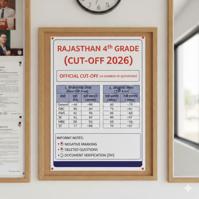 राजस्थान कर्मचारी चयन बोर्ड (RSSB) द्वारा 16 जनवरी 2026 को जारी की गई चतुर्थ श्रेणी (Group D) भर्ती की आधिकारिक कट-ऑफ की पूरी जानकारी हिंदी लिपि में नीचे दी गई है: